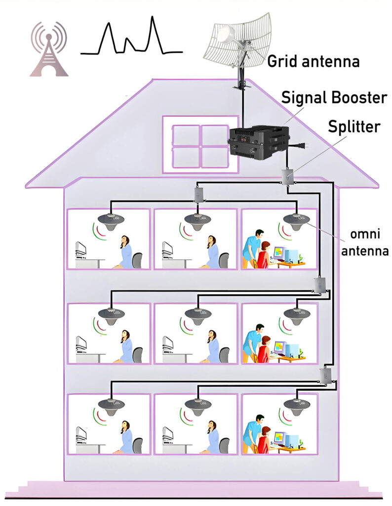3. Amplifies Signal – The booster increases the signal strength exponentially (e.g., by 30x to 70x) using internal circuitry. Modern boosters adjust gain automatically to avoid interference.